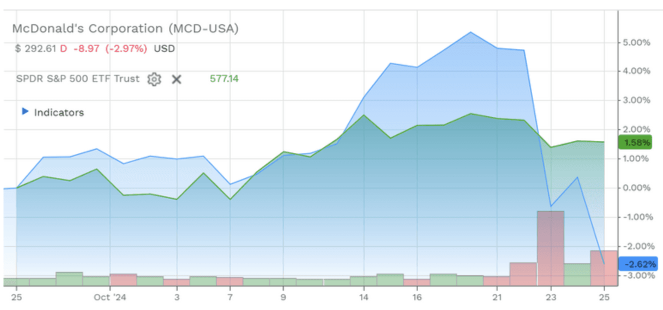 McDonald's (-7.6%) suffered due to an E. coli outbreak linked to its Quarter Pounder hamburgers, impacting its brand perception.