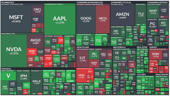 This week, U.S. equities edged higher, with the Dow gaining +0.96%, the S&P 500 rising +0.85%, the Nasdaq adding +0.80%, and the Russell 2000 outperforming with a +1.87% increase. The rally marked the sixth consecutive week of gains for major indices, led by strong performances in big tech. Notable movers included Apple (+3.3%) and NVIDIA (+2.4%). Key outperforming sectors included airlines, homebuilders, and utilities, while energy and semiconductors lagged behind.