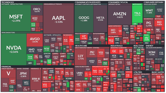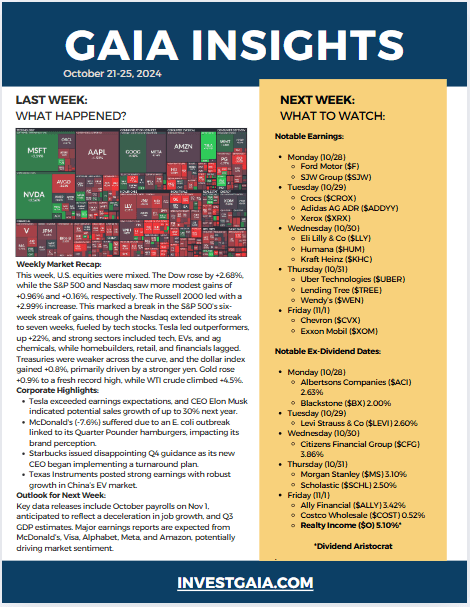 This week, U.S. equities were mixed. The Dow rose by +2.68%, while the S&P 500 and Nasdaq saw more modest gains of +0.96% and +0.16%, respectively. The Russell 2000 led with a +2.99% increase. This marked a break in the S&P 500’s six-week streak of gains, though the Nasdaq extended its streak to seven weeks, fueled by tech stocks. Tesla led outperformers, up +22%, and strong sectors included tech, EVs, and ag chemicals, while homebuilders, retail, and financials lagged.