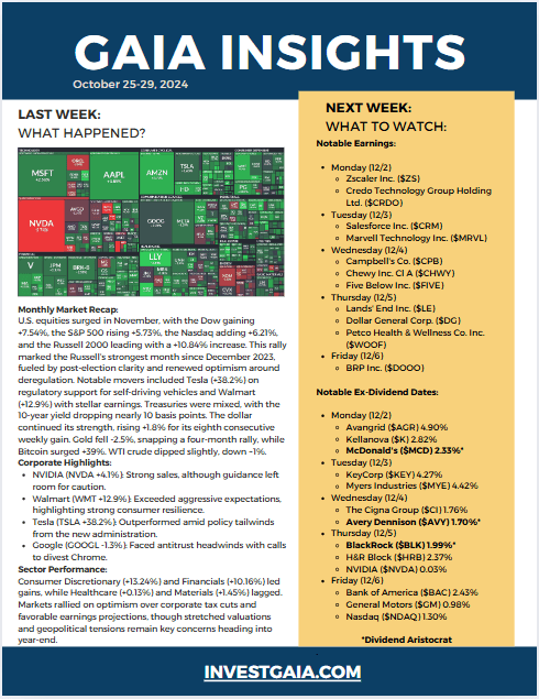U.S. equities surged in November, with the Dow gaining +7.54%, the S&P 500 rising +5.73%, the Nasdaq adding +6.21%, and the Russell 2000 leading with a +10.84% increase. This rally marked the Russell’s strongest month since December 2023, fueled by post-election clarity and renewed optimism around deregulation. Notable movers included Tesla (+38.2%) on regulatory support for self-driving vehicles and Walmart (+12.9%) with stellar earnings. Treasuries were mixed, with the 10-year yield dropping nearly 10 basis points. The dollar continued its strength, rising +1.8% for its eighth consecutive weekly gain. Gold fell -2.5%, snapping a four-month rally, while Bitcoin surged +39%. WTI crude dipped slightly, down ~1%.
