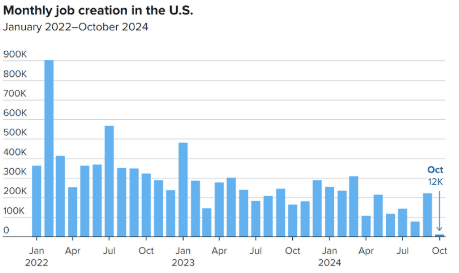 October’s employment report brought disappointing news, as the U.S. added just 12,000 jobs, marking the weakest monthly gain since 2020 and falling well short of the anticipated 100,000. This low number reflects the disruptive impacts of recent hurricanes in the Southeast and a prolonged labor strike at Boeing. Manufacturing bore the brunt of these challenges, shedding 46,000 jobs, with an estimated 44,000 directly tied to the Boeing strike. Despite the minimal job gains, the unemployment rate held steady at 4.1%, matching expectations. Health care and government provided some positive movement, adding 52,000 and 40,000 positions, respectively. However, other sectors struggled, with declines in leisure, hospitality, and temporary help services. The latter, often seen as a gauge of underlying labor strength, has continued a downward trend since March 2022. This complex employment landscape complicates the Federal Reserve’s approach to monetary policy. With inflation showing signs of easing, the Fed had already cut rates in September to bolster the economy. Now, this weaker-than-expected jobs report places additional pressure on the central bank as it considers another rate cut in its upcoming meeting. Analysts remain cautiously optimistic, suggesting that these setbacks may be temporary. As the effects of the Boeing strike and recent hurricanes fade, the coming months will be crucial in assessing whether the economy can regain hiring momentum or if underlying challenges in the labor market will persist. This report underscores the unpredictable nature of the labor market, which remains affected by both economic and environmental factors.
