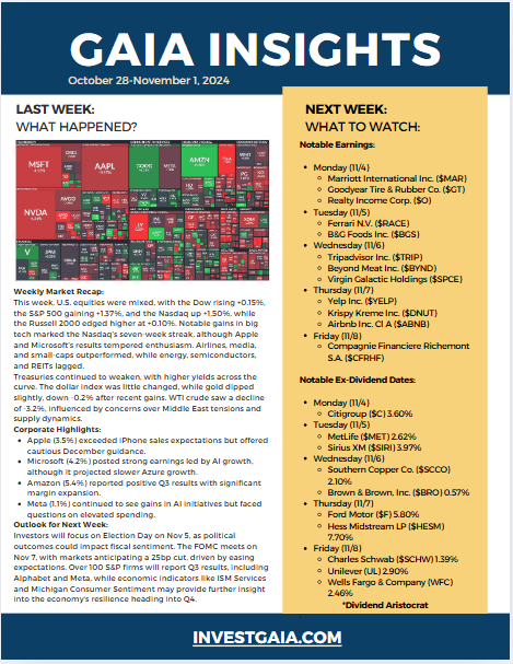 Investors will focus on Election Day on Nov 5, as political outcomes could impact fiscal sentiment. The FOMC meets on Nov 7, with markets anticipating a 25bp cut, driven by easing expectations. Over 100 S&P firms will report Q3 results, including Alphabet and Meta, while economic indicators like ISM Services and Michigan Consumer Sentiment may provide further insight into the economy's resilience heading into Q4.