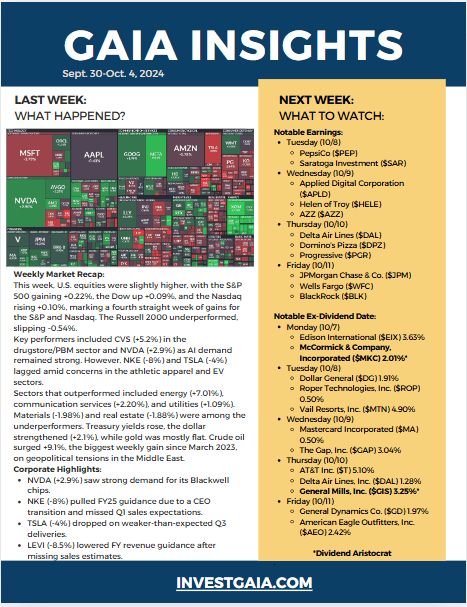 This week, U.S. equities were slightly higher, with the S&P 500 gaining +0.22%, the Dow up +0.09%, and the Nasdaq rising +0.10%, marking a fourth straight week of gains for the S&P and Nasdaq. The Russell 2000 underperformed, slipping -0.54%.